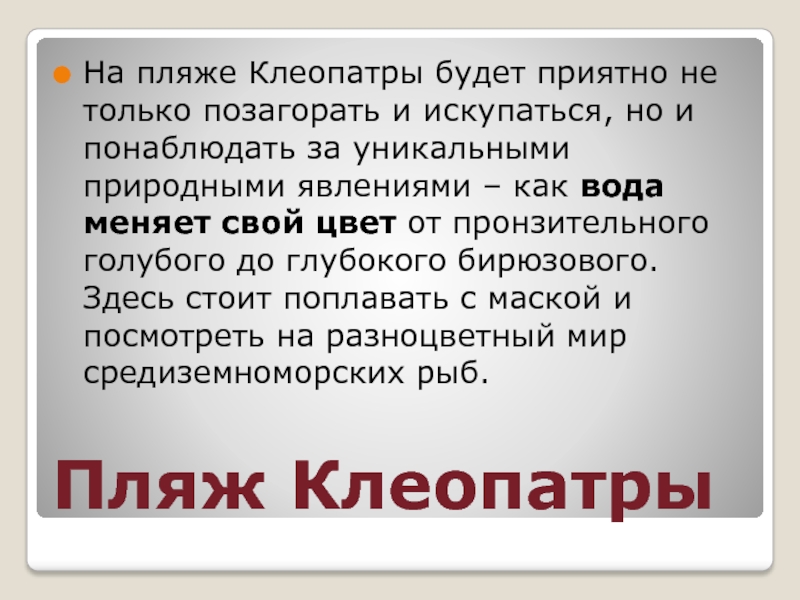 Пляж КлеопатрыНа пляже Клеопатры будет приятно не только позагорать и искупаться, но и понаблюдать за уникальными природными