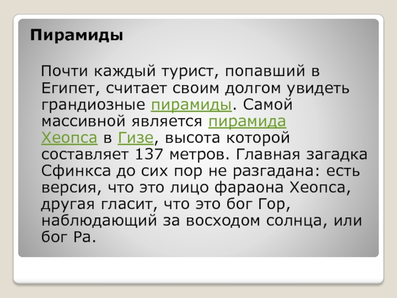 грандиозные пирамиды. Самой массивной является пирамида Хеопса в Гизе, высота которой составляет 137 метров. Главная загадка Сфинкса до сих пор не разгадана: есть версия, что это лицо фараона Хеопса, другая гласит, что это бог Гор, наблюдающий за восходом солнца, или бог Ра.