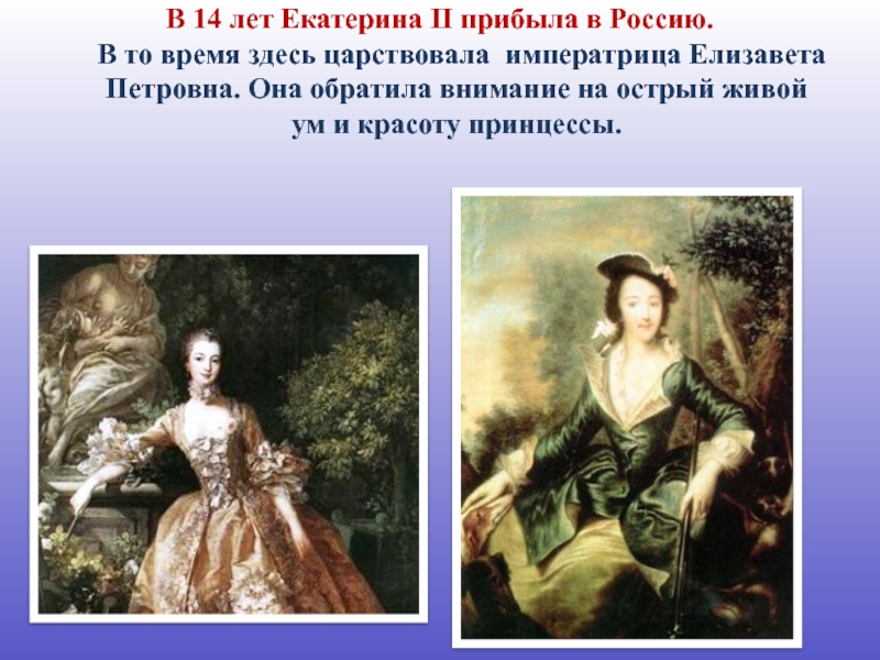 В 14 лет Екатерина II прибыла в Россию.  	В то время здесь царствовала императрица Елизавета Петровна.
