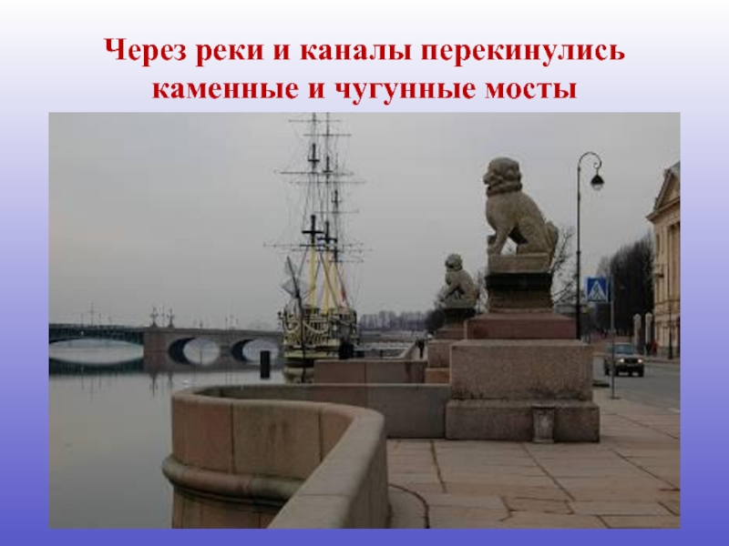 Слайд 19Через реки и каналы перекинулись каменные и чугунные мосты