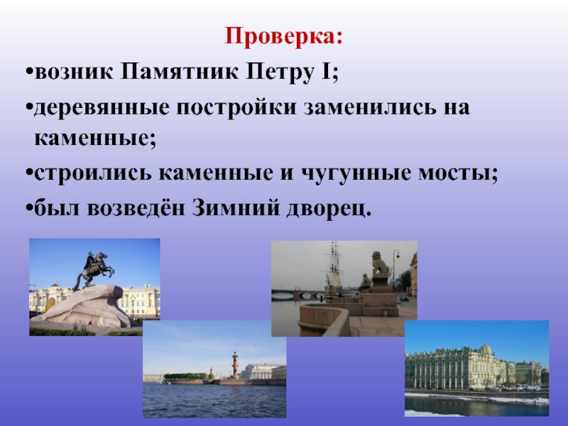 Проверка:возник Памятник Петру I;деревянные постройки заменились на каменные;строились каменные и чугунные мосты;был возведён Зимний дворец.