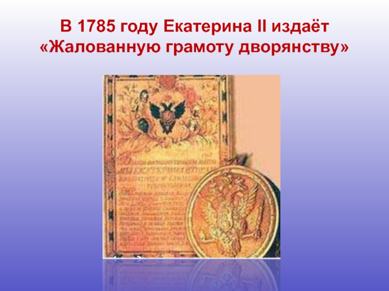 Слайд 28В 1785 году Екатерина II издаёт «Жалованную грамоту дворянству»