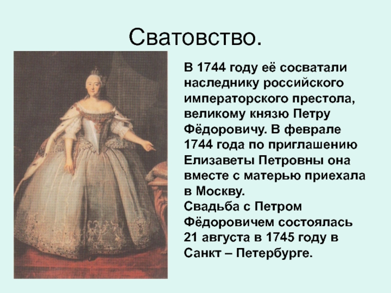Петру Фёдоровичу. В феврале 1744 года по приглашению Елизаветы Петровны она вместе с матерью приехала в Москву.