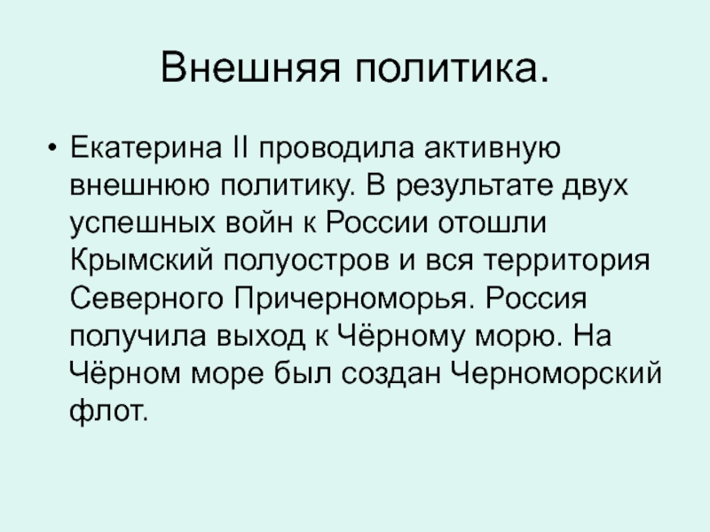 войн к России отошли Крымский полуостров и вся территория Северного Причерноморья. Россия получила выход к Чёрному морю. На Чёрном море был создан Черноморский флот.