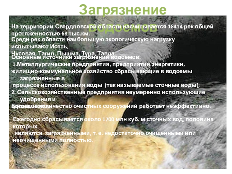 Среди рек области наибольшую экологическую нагрузку испытывают Исеть,
