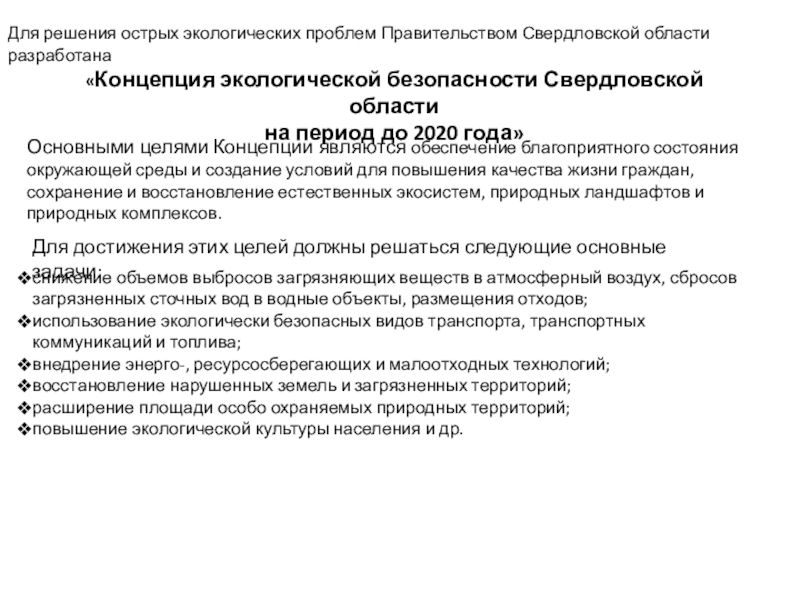 Основными целями Концепции являются обеспечение благоприятного состояния окружающей среды и создание условий для повышения качества жизни граждан, сохранение и восстановление естественных экосистем, природных ландшафтов и природных комплексов.