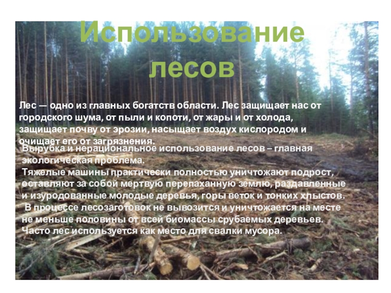 Вырубка и нерациональное использование лесов – главная экологическая проблема.