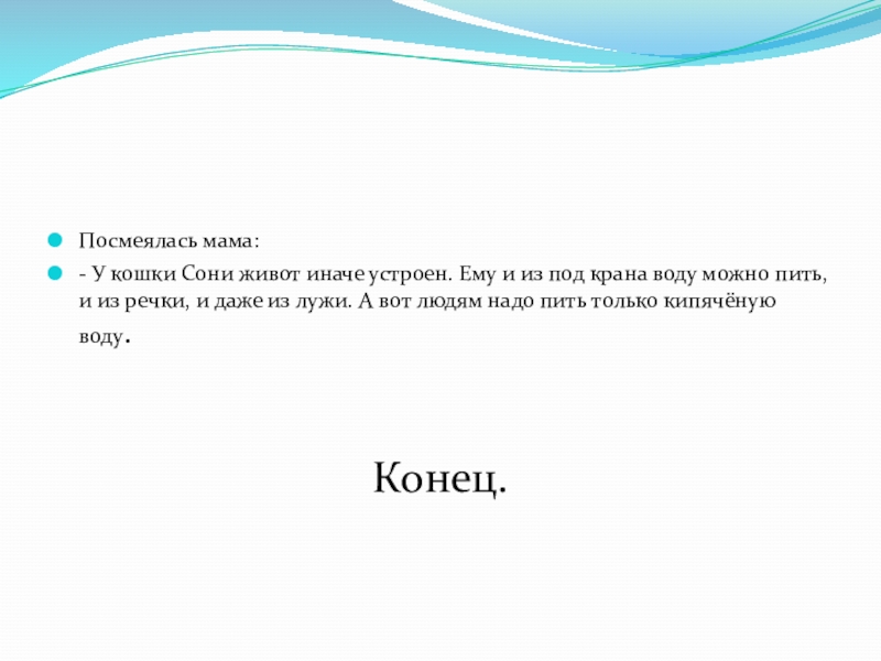 Посмеялась мама:- У кошки Сони живот иначе устроен. Ему и из под крана воду можно пить, и