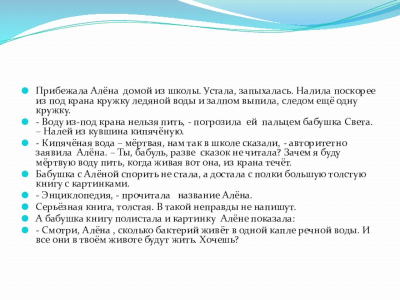 - Смотри, Алёна , сколько бактерий живёт в одной капле речной воды. И все они в твоём животе будут жить. Хочешь?