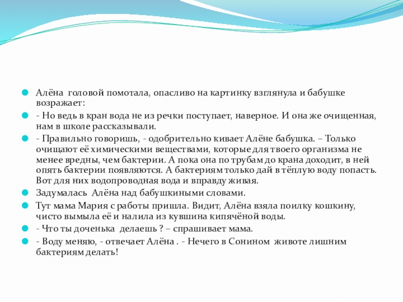 - Правильно говоришь, - одобрительно кивает Алёне бабушка. – Только очищают её химическими веществами, которые для твоего организма не менее вредны, чем бактерии. А пока она по трубам до крана доходит, в ней опять бактерии появляются. А бактериям только дай в тёплую воду попасть. Вот для них водопроводная вода и вправду живая.