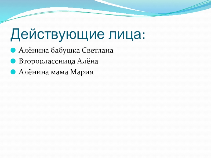 Действующие лица:Алёнина бабушка СветланаВтороклассница АлёнаАлёнина мама Мария
