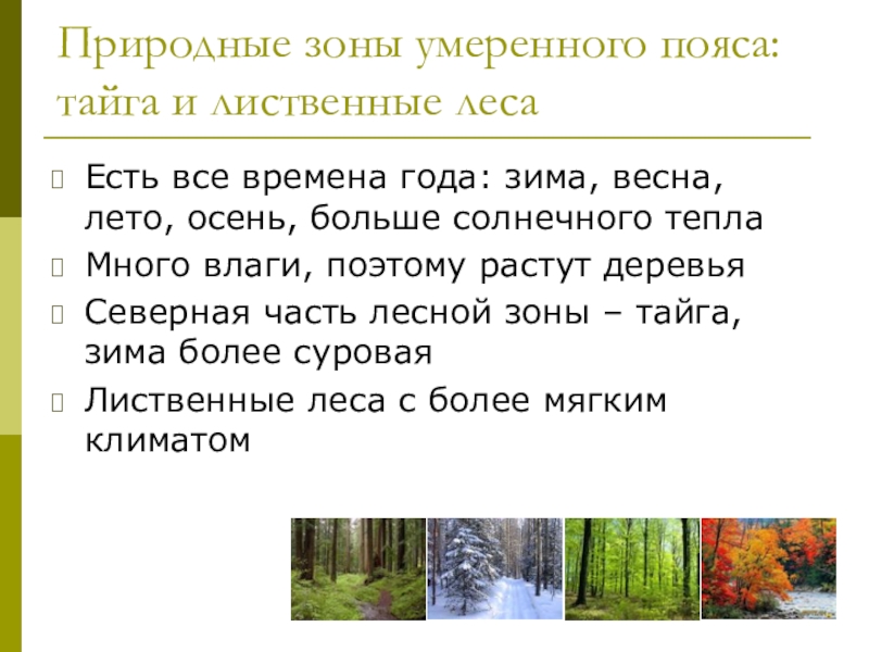 Слайд 8Природные зоны умеренного пояса: тайга и лиственные леса
