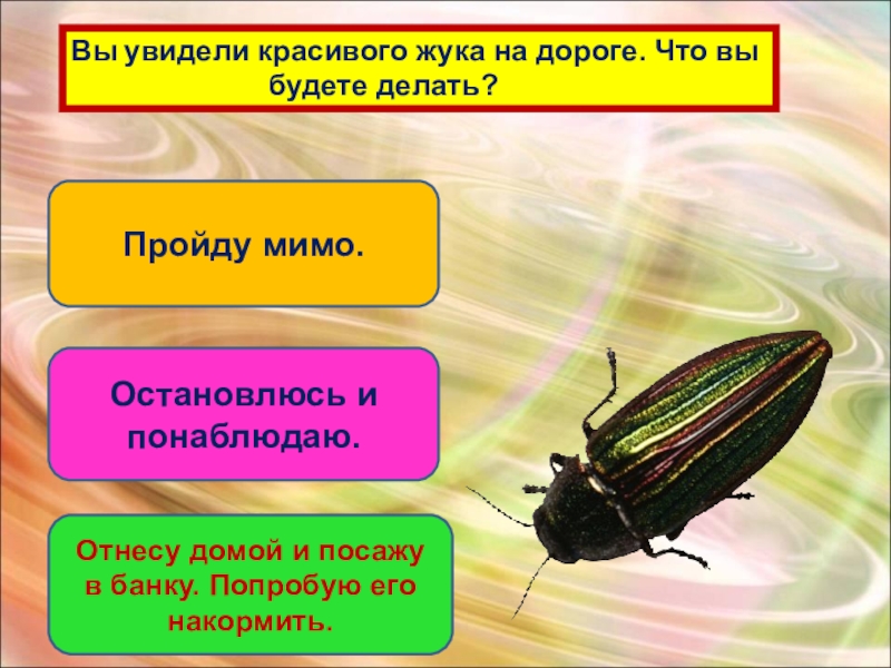 Отнесу домой и посажу в банку. Попробую его накормить.