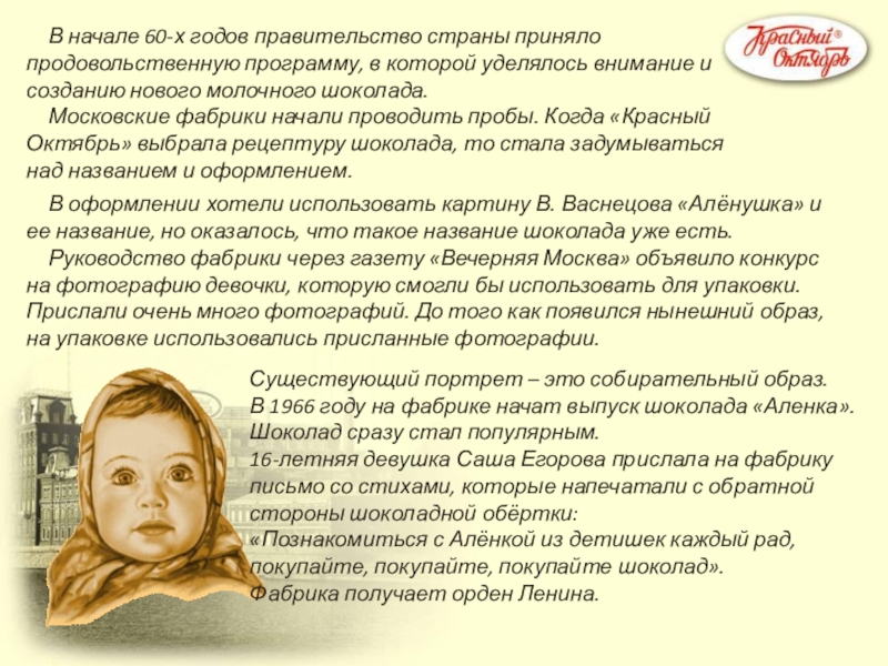 «Познакомиться с Алёнкой из детишек каждый рад, покупайте, покупайте, покупайте шоколад».