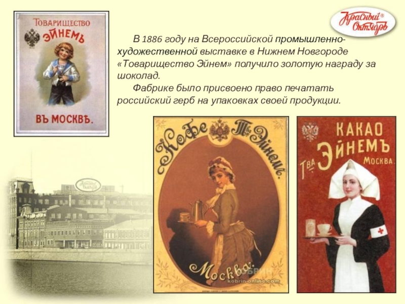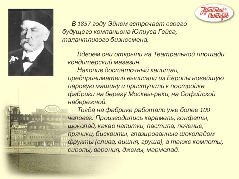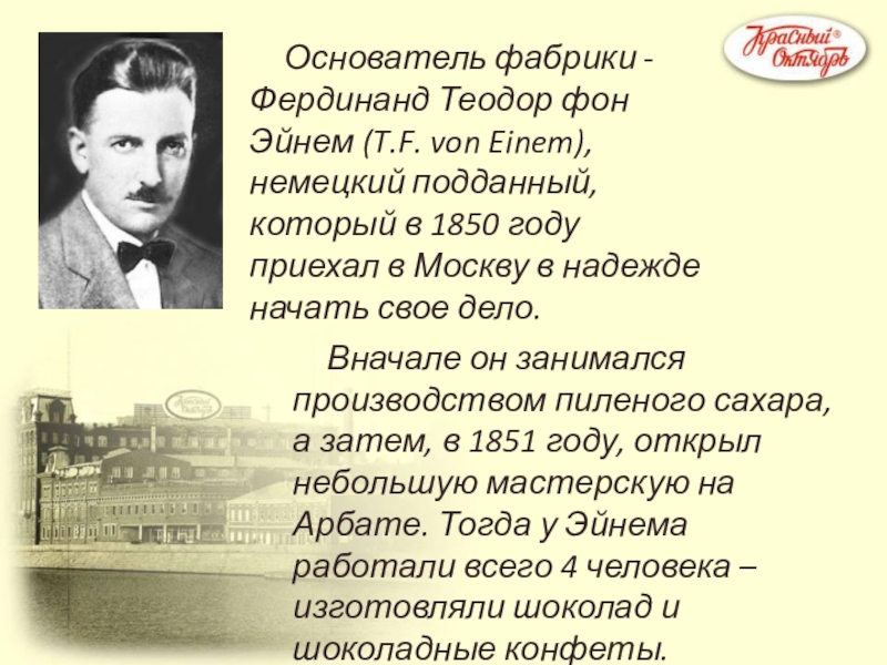 Основатель фабрики - Фердинанд Теодор фон Эйнем (T.F. von Einem), немецкий подданный, который в 1850 году приехал в Москву в надежде начать свое дело.