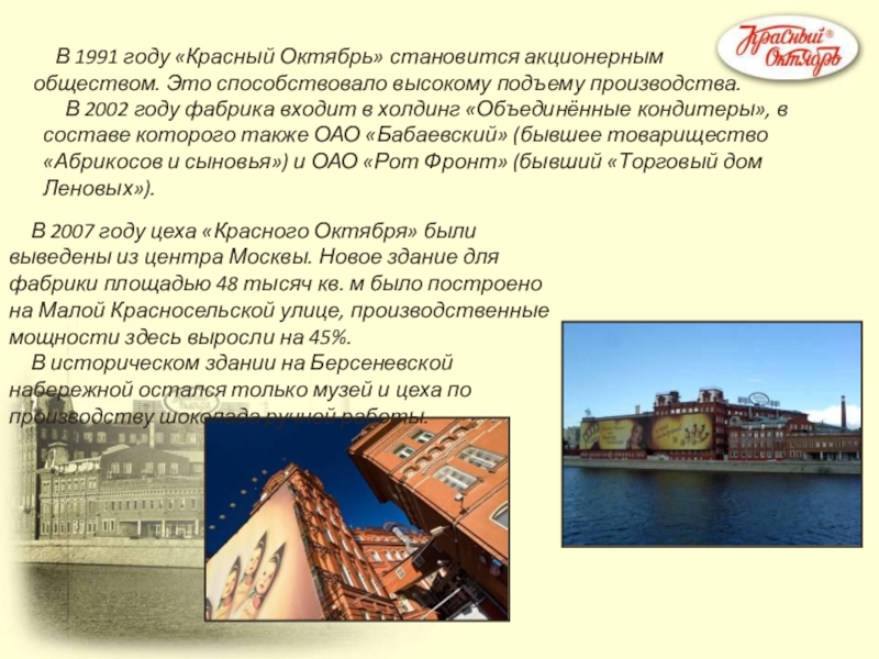 В 2007 году цеха «Красного Октября» были выведены из центра Москвы. Новое здание для фабрики площадью 48 тысяч кв. м было построено на Малой Красносельской улице, производственные мощности здесь выросли на 45%.