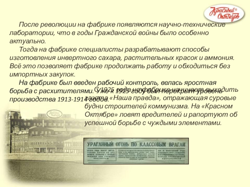 С 1925 года на фабрике начинает выходить газета «Наша правда», отражающая суровые будни строителей коммунизма. На «Красном Октябре» ловят вредителей и рапортуют об успешной борьбе с чуждыми элементами.