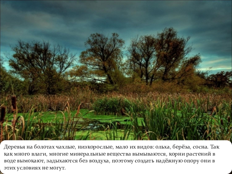 Слайд 4Деревья на болотах чахлые, низкорослые, мало их видов: ольха, берёза, сосна.