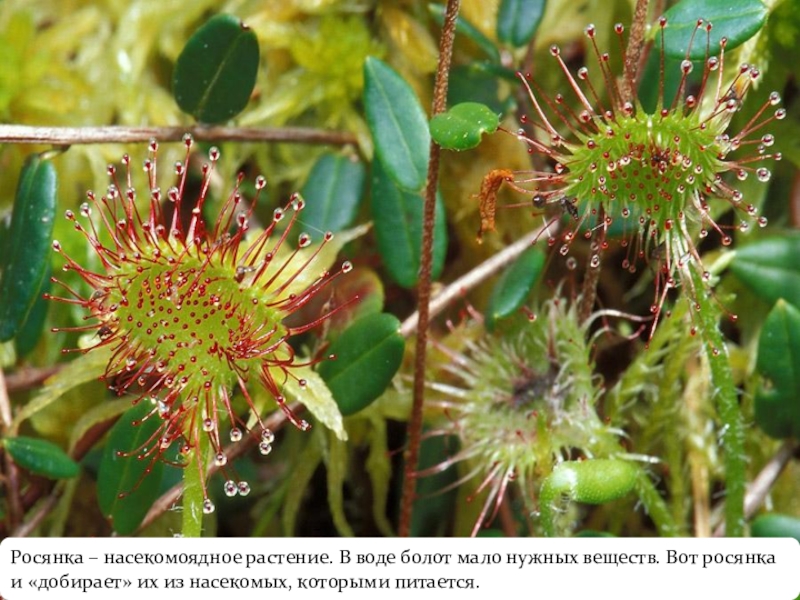 Слайд 7Росянка – насекомоядное растение. В воде болот мало нужных веществ. Вот