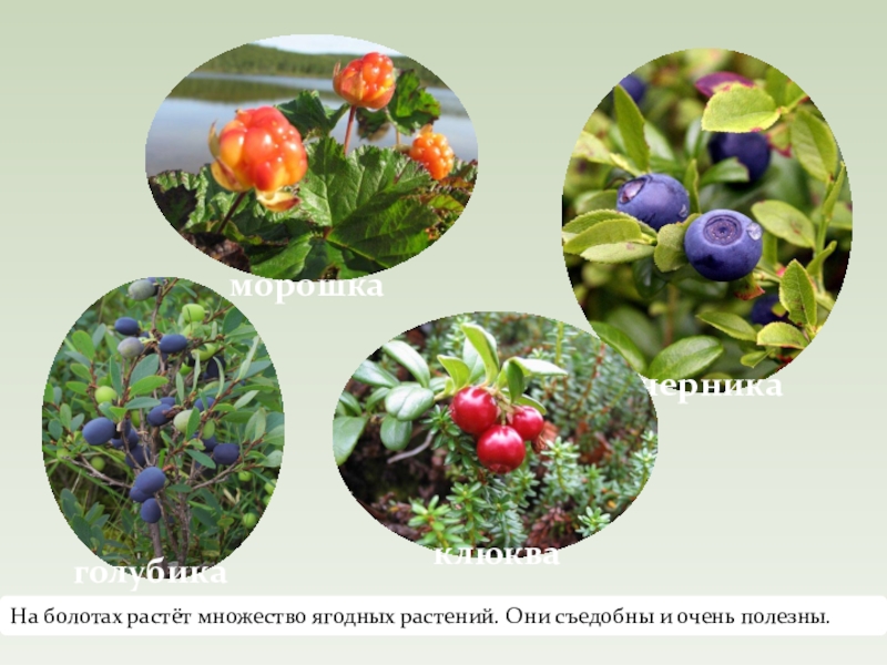 Слайд 6На болотах растёт множество ягодных растений. Они съедобны и очень полезны.