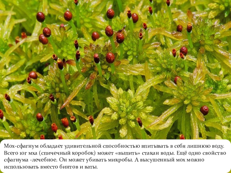 Слайд 8Мох-сфагнум обладает удивительной способностью впитывать в себя лишнюю воду. Всего 10г