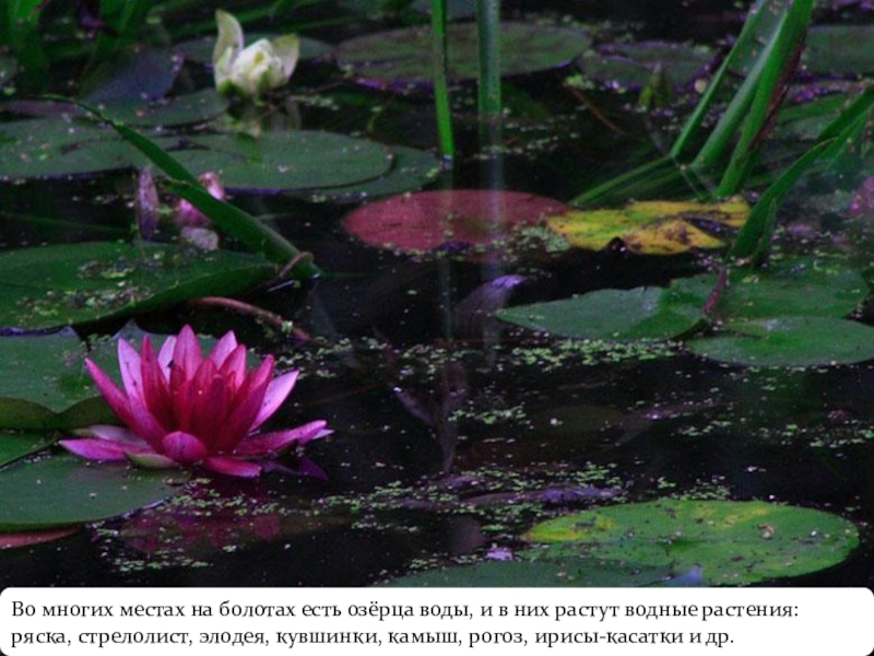 Слайд 5Во многих местах на болотах есть озёрца воды, и в них