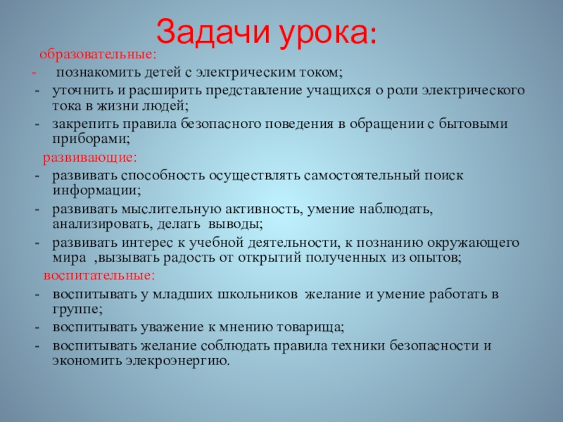 воспитывать желание соблюдать правила техники безопасности и экономить элекроэнергию.