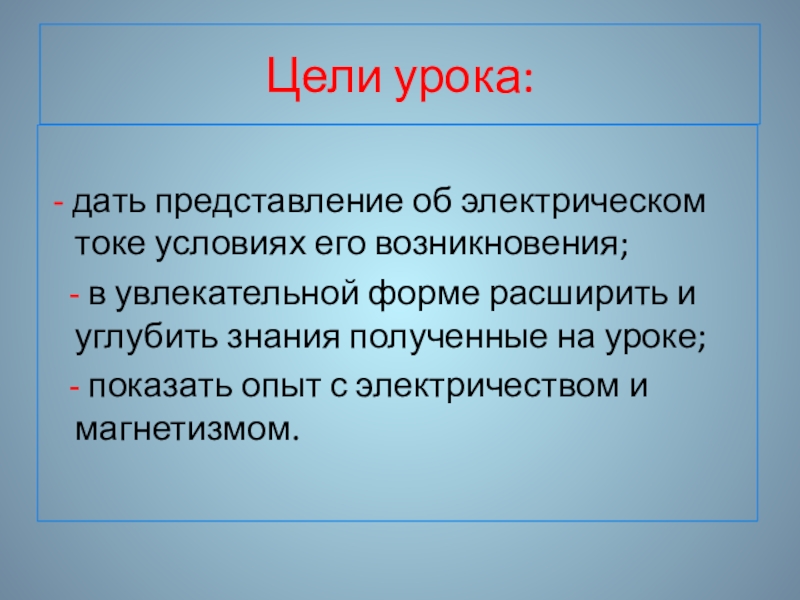 расширить представление учащихся о роли электрического тока в жизни людей;