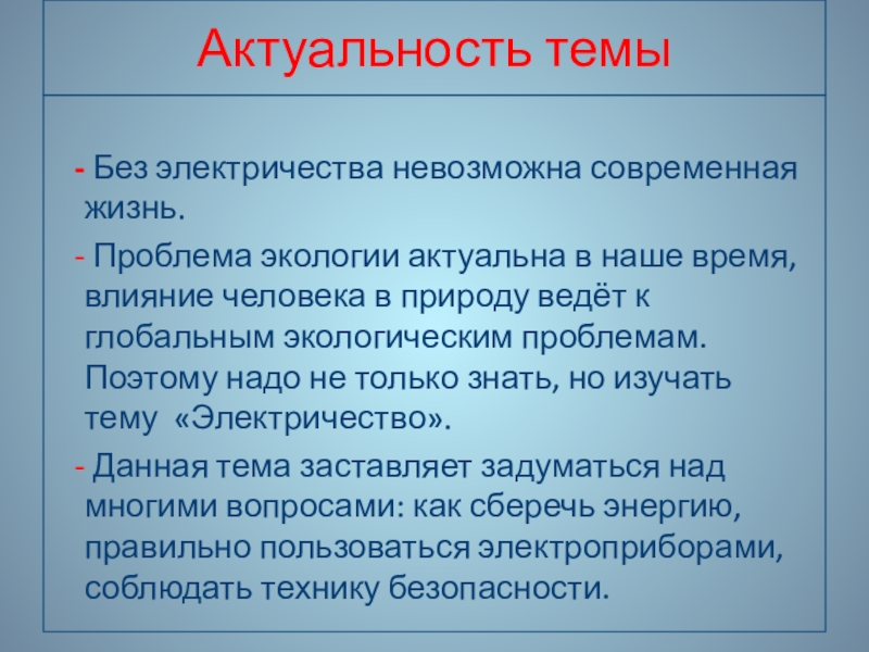 экологии актуальна в наше время, влияние человека в природу ведёт к глобальным экологическим проблемам. Поэтому надо не только знать, но изучать тему «Электричество».