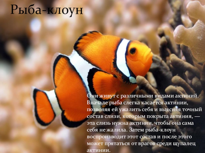 Рыба-клоунОни живут с различными видами актиний. Вначале рыба слегка касается актинии, позволяя ей ужалить себя и выясняя
