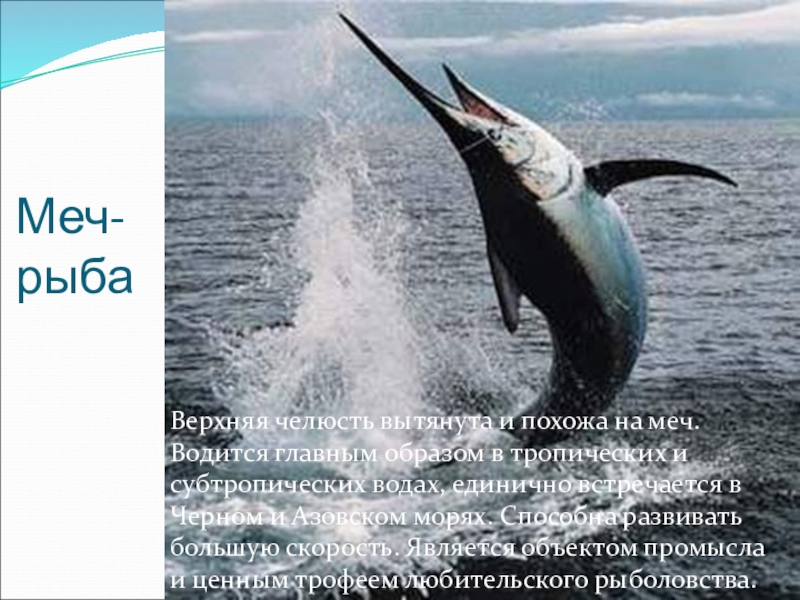 Меч- рыбаВерхняя челюсть вытянута и похожа на меч. Водится главным образом в тропических и субтропических водах, единично