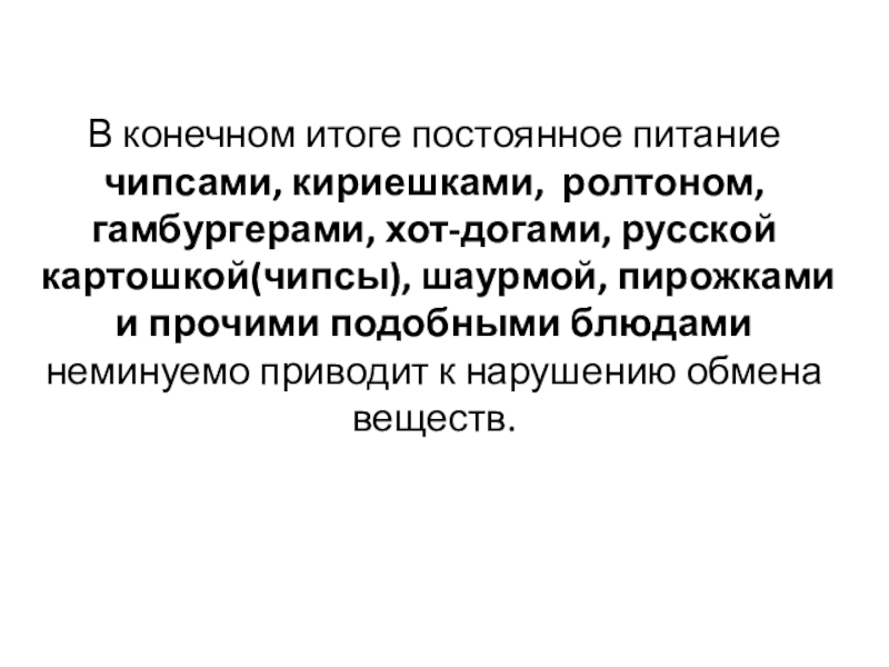 Слайд 20В конечном итоге постоянное питание чипсами, кириешками, ролтоном, гамбургерами, хот-догами, русской