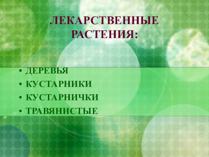 ЛЕКАРСТВЕННЫЕ РАСТЕНИЯ:ДЕРЕВЬЯКУСТАРНИКИКУСТАРНИЧКИТРАВЯНИСТЫЕ