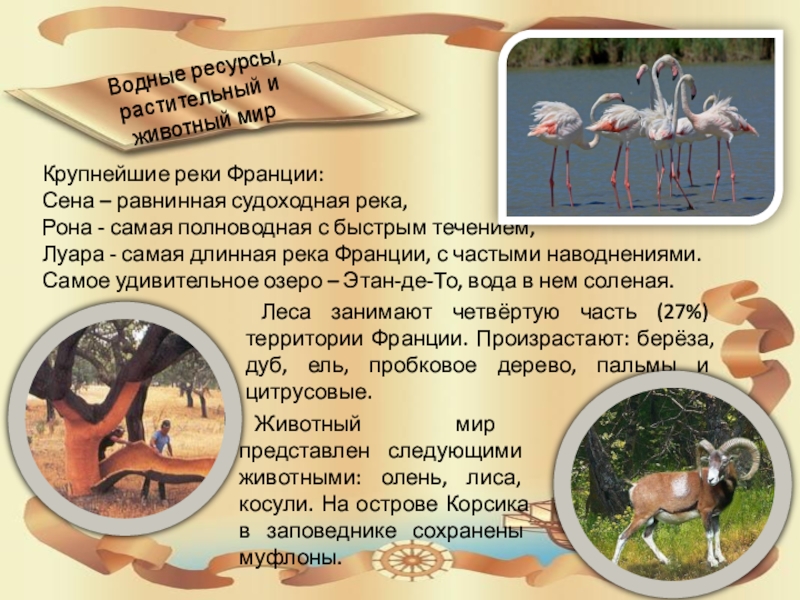 Леса занимают четвёртую часть (27%) территории Франции. Произрастают: берёза, дуб, ель, пробковое дерево, пальмы и цитрусовые.