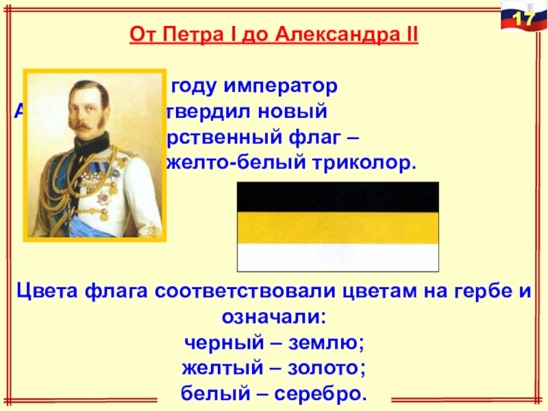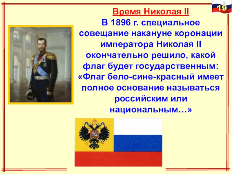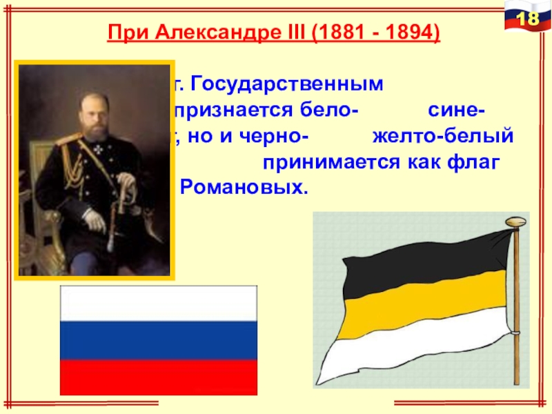 вновь признается бело- сине-красный флаг, но и черно- желто-белый не исчезает, а принимается как флаг династии Романовых.