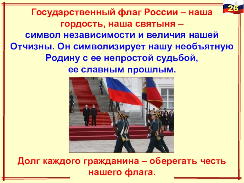 Слайд 26Государственный флаг России – наша гордость, наша святыня –
