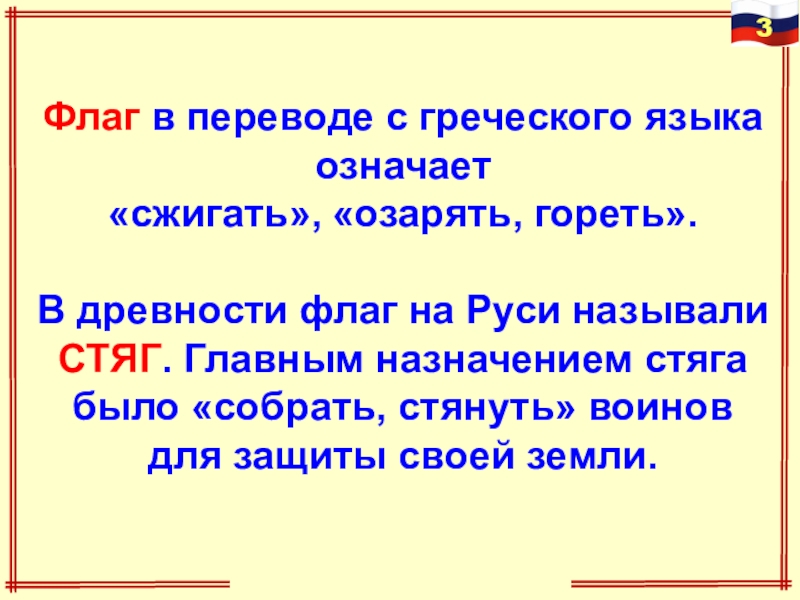 древности флаг на Руси называли СТЯГ. Главным назначением стяга было «собрать, стянуть» воинов для защиты своей земли.