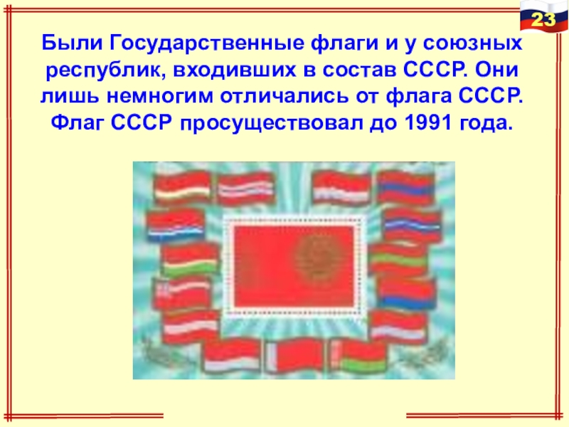 Слайд 23Были Государственные флаги и у союзных республик, входивших в состав СССР.