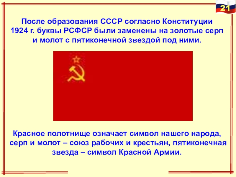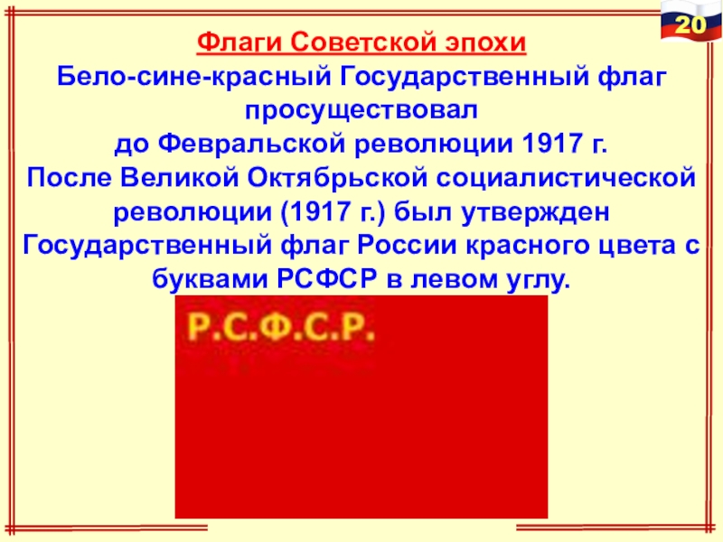 Великой Октябрьской социалистической революции (1917 г.) был утвержден Государственный флаг России красного цвета с буквами РСФСР в левом углу.