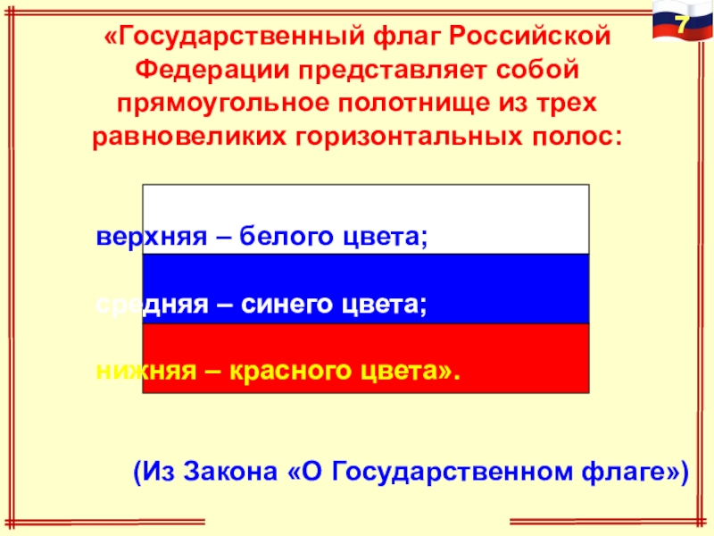 Слайд 7«Государственный флаг Российской Федерации представляет собой прямоугольное полотнище из трех равновеликих