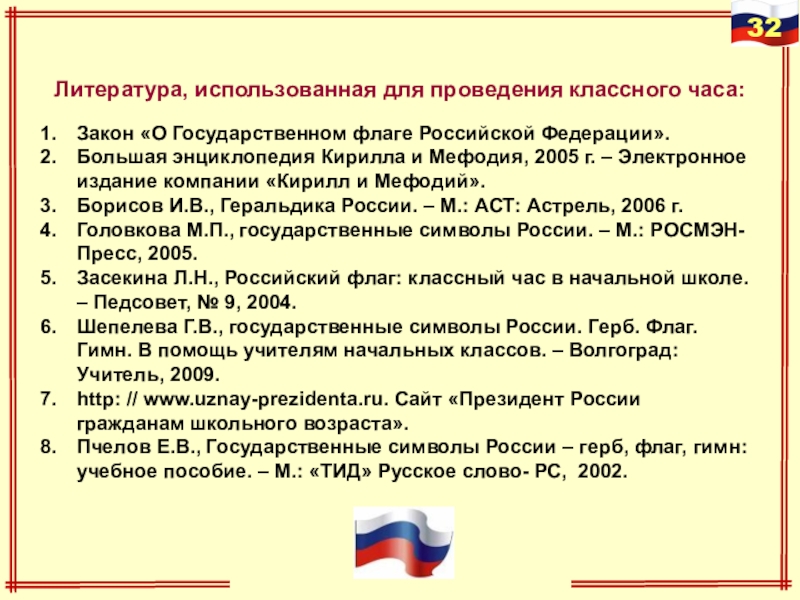 Засекина Л.Н., Российский флаг: классный час в начальной школе. – Педсовет, № 9, 2004.