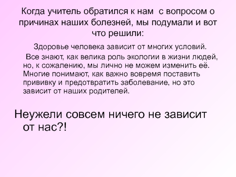 Все знают, как велика роль экологии в жизни людей, но, к сожалению, мы лично не можем изменить её. Многие понимают, как важно вовремя поставить прививку и предотвратить заболевание, но это зависит от наших родителей.