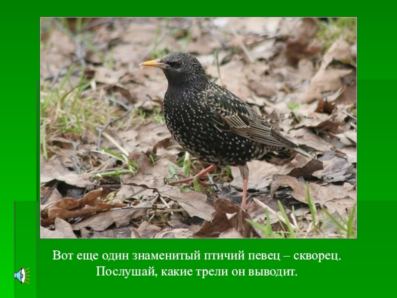Вот еще один знаменитый птичий певец – скворец.Послушай, какие трели он выводит.
