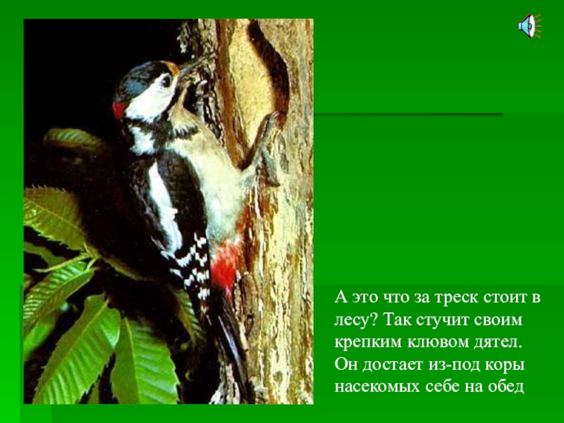 А это что за треск стоит в лесу? Так стучит своимкрепким клювом дятел. Он достает из-под коры