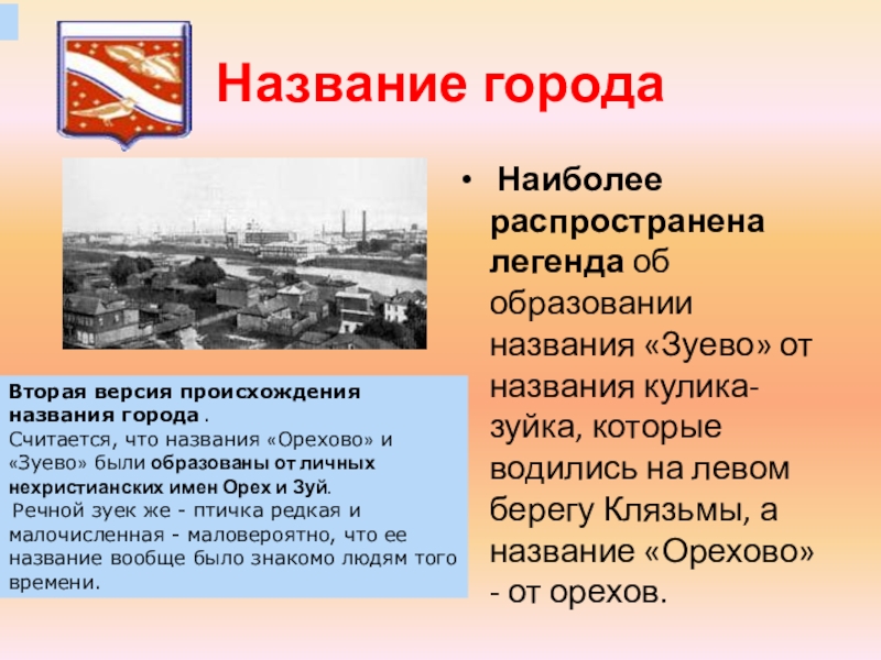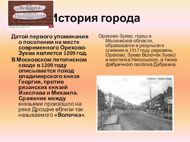 Орехово-Зуево, город в Московской области, образовался в результате слияния в 1917 году деревень Орехово, Зуево Волочёк Зуев)) и местечка Никольское, а также фабричного посёлка Дубровка.