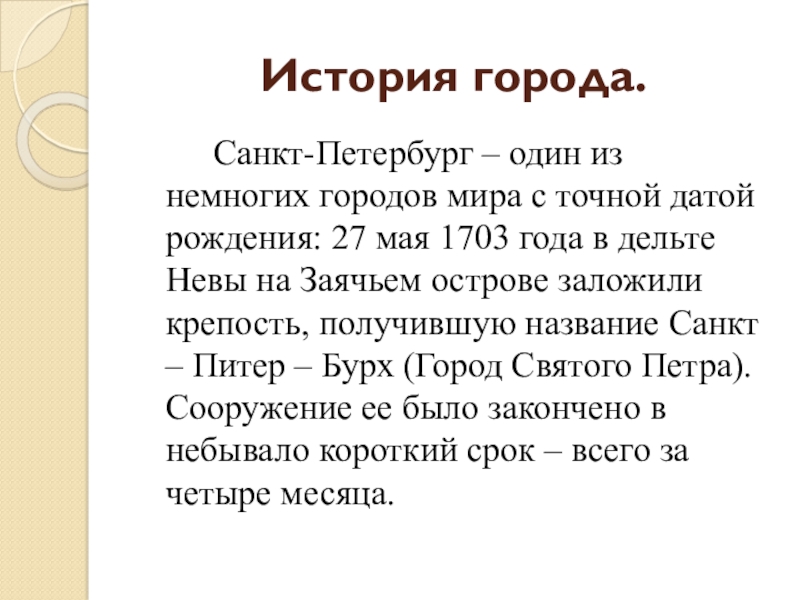 рождения: 27 мая 1703 года в дельте Невы на Заячьем острове заложили крепость, получившую название Санкт – Питер – Бурх (Город Святого Петра). Сооружение ее было закончено в небывало короткий срок – всего за четыре месяца.