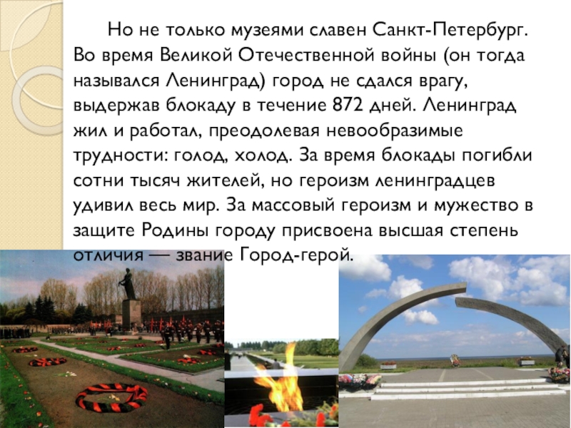 войны (он тогда назывался Ленинград) город не сдался врагу, выдержав блокаду в течение 872 дней. Ленинград жил и работал, преодолевая невообразимые трудности: голод, холод. За время блокады погибли сотни тысяч жителей, но героизм ленинградцев удивил весь мир. За массовый героизм и мужество в защите Родины городу присвоена высшая степень отличия — звание Город-герой.