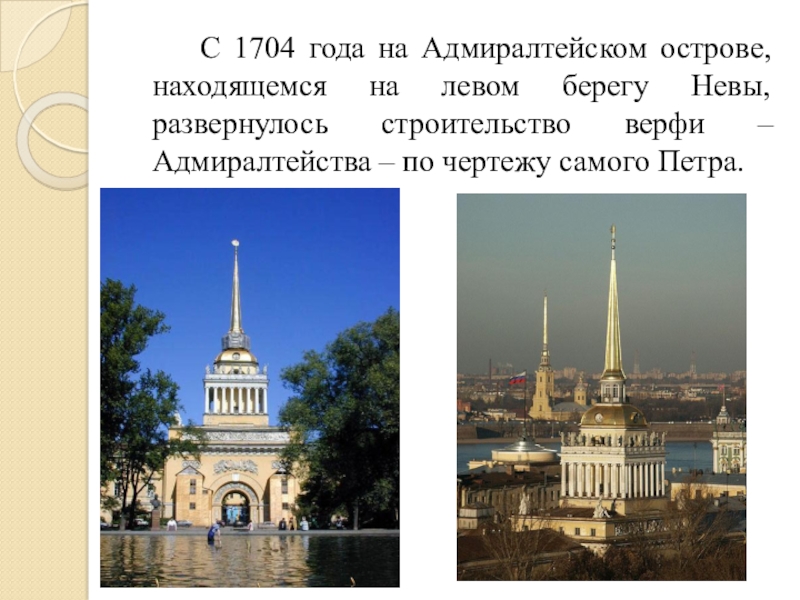 Слайд 9 С 1704 года на Адмиралтейском острове, находящемся на левом берегу Невы,