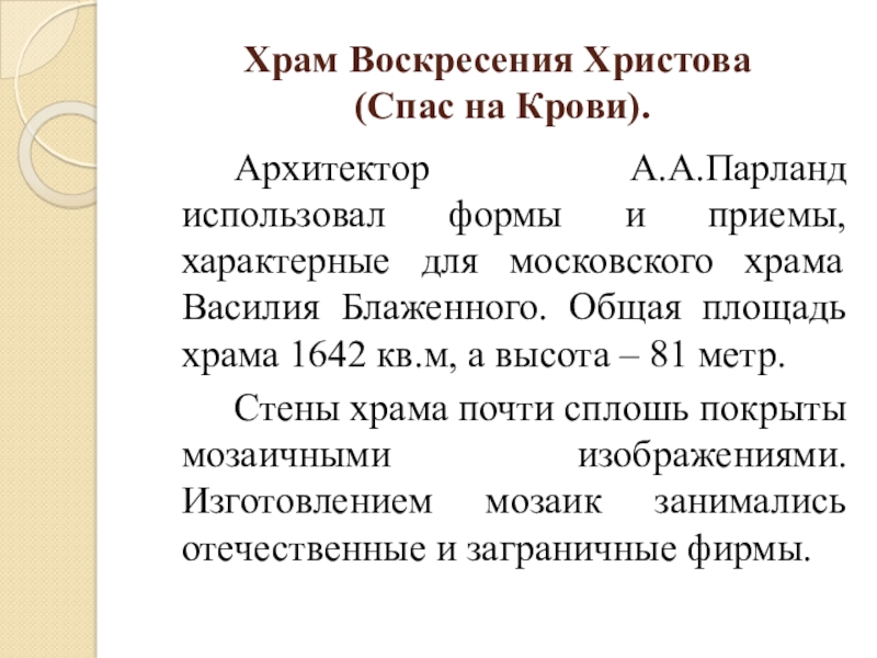 приемы, характерные для московского храма Василия Блаженного. Общая площадь храма 1642 кв.м, а высота – 81 метр.