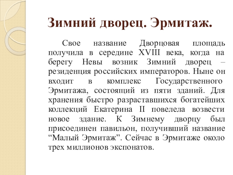 века, когда на берегу Невы возник Зимний дворец – резиденция российских императоров. Ныне он входит в комплекс Государственного Эрмитажа, состоящий из пяти зданий. Для хранения быстро разраставшихся богатейших коллекций Екатерина II повелела возвести новое здание. К Зимнему дворцу был присоединен павильон, получивший название “Малый Эрмитаж”. Сейчас в Эрмитаже около трех миллионов экспонатов.